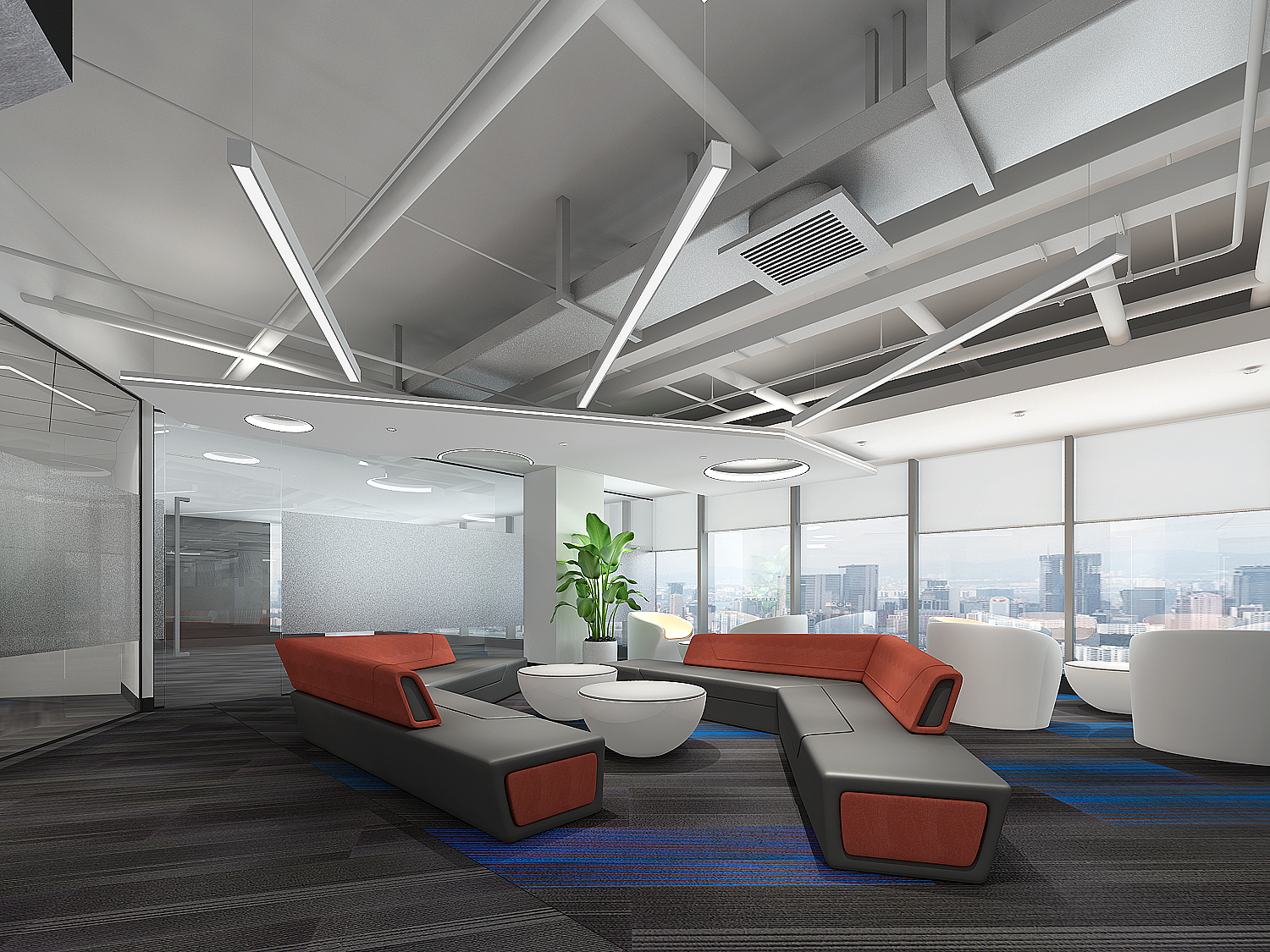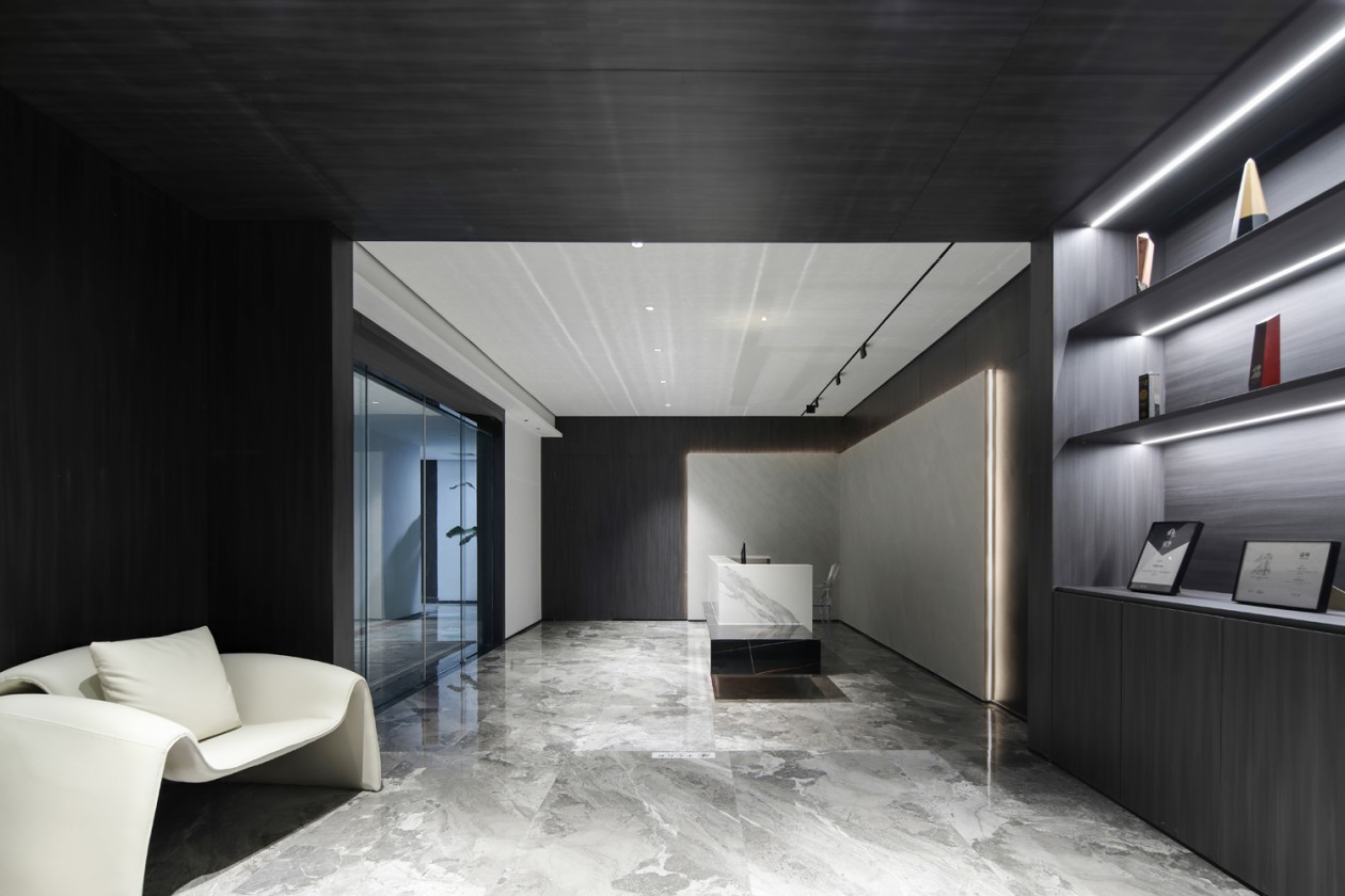 整體空間被劃分成兩個不同的功能區域,開放式辦公區以組團的形式分布于光線最好的位置,休閑區、洽談區、等則充滿創意的散布在工位區附近。將多個節點、路徑應用到空間中,合理分配各節點服務的功能區,形成非線性的空間序列,賦予了空間靈活性。